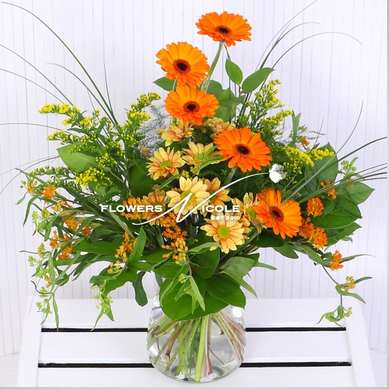 We have created an October Birthday Bouquet emulating those cheerful little Marigolds using our joyful, orange Germinis. Marigolds are known to represent energy, good luck, warmth & creativity - we also use orange Germinis in our Signature ‘Joyful Nicole’ LIVE, LAUGH, LOVE BOUQUETS