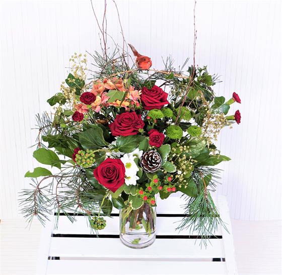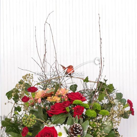 Bobbin’ Robin with nose in a rose, framed with seasonal flowers 'n' foliages, touched with gold the Flowers Nicole 'Traditional Christmas' bouquet is a true favourite complete with snow-topped pine cone