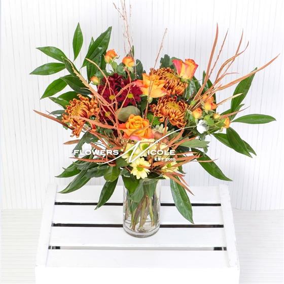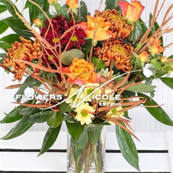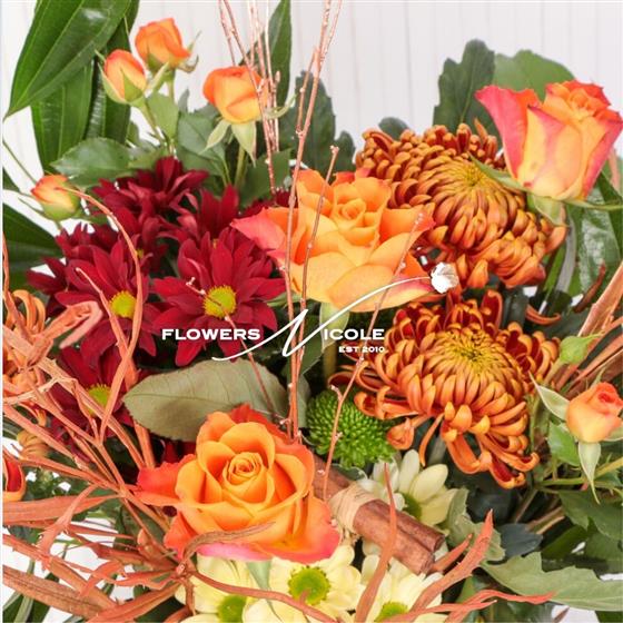 Flames of copper, red & amber rise with many a memory of favourite times. Roses, Chrysanthemum Blooms & Cinnamon stick sheen! Each of our Signature bouquets tell a story-'Core Values'.