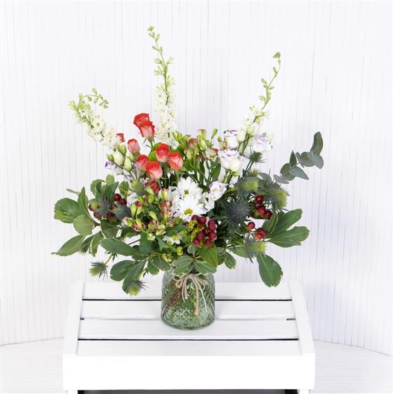 Our beautiful city of Norwich has many country lanes surrounding it. Hedgerow Nostalgia celebrates dainty flower and fauna with a variety of textures informally gathered on a bed of foliage beneath tall white Larkspur.