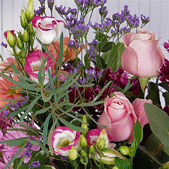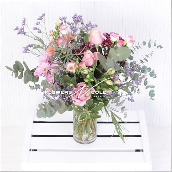 Avalanche Pink Roses & pink tipped Lisianthus, tall Alstroemeria, pink 'Mums' & grey green Eucalyptus add a wellbeing aroma with ‘time stopping’ charm. Each of our Signature bouquets tell a story