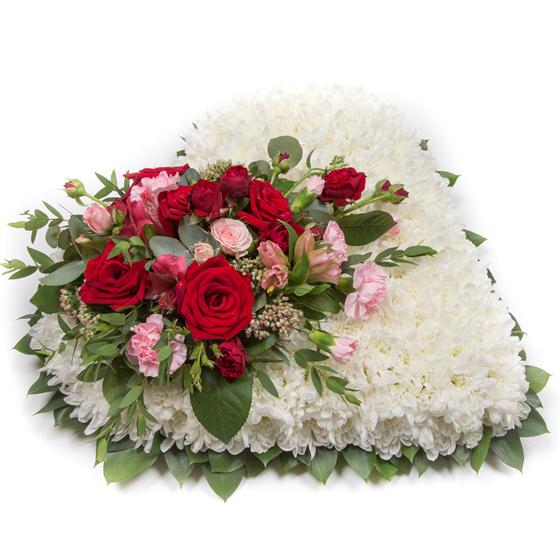 A mass based heart shaped tribute with a deep red rose spray intertwined with baby pink spray, delicate foliage and alstroemeria. Available with a foliage or ribbon surround in the colour of your choice.