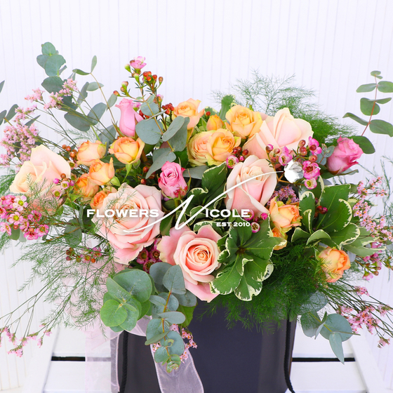 A classy combination of Big Headed Roses and smaller Spray Roses in a complimentary pink selection - on trailing grey green Eucalyptus foliage finished with touches of pink Sea Lavender.