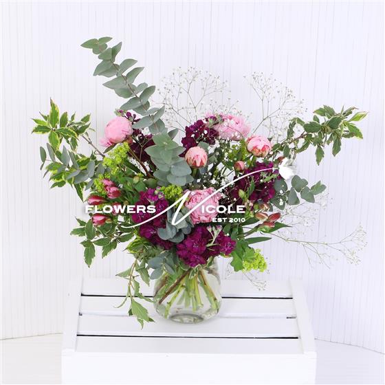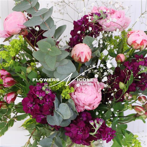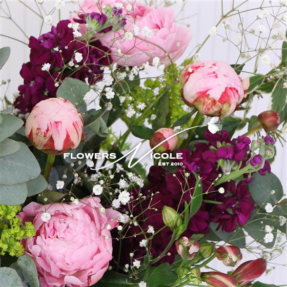 HOORAY it's Peony season again! The Plum Peony is a comfortable blend of fluffly pink Peonies tied with clouds of Gypsophilia & aromatic Eucalyptus on a plum base - created in our Norwich Florist