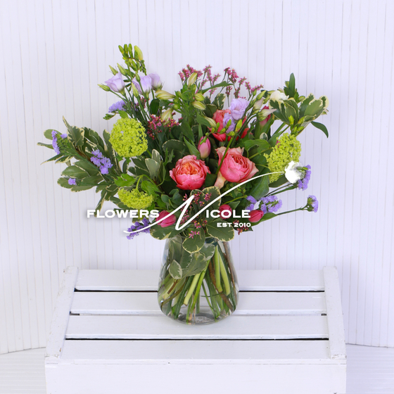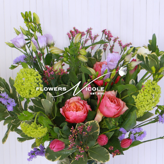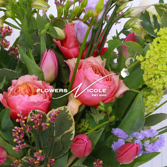 Embracing this fresh beauty we have created the SPRINGTIME BOUQUET boasting lime green Viburnum clusters and clumps of vibrant Tulips interspersed with scented Freesia and lilac Limonium crowned with large headed old fashioned roses.